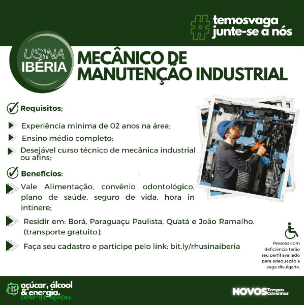 A Usina Ibéria, unidade de Borá, está com quatro vagas de emprego.