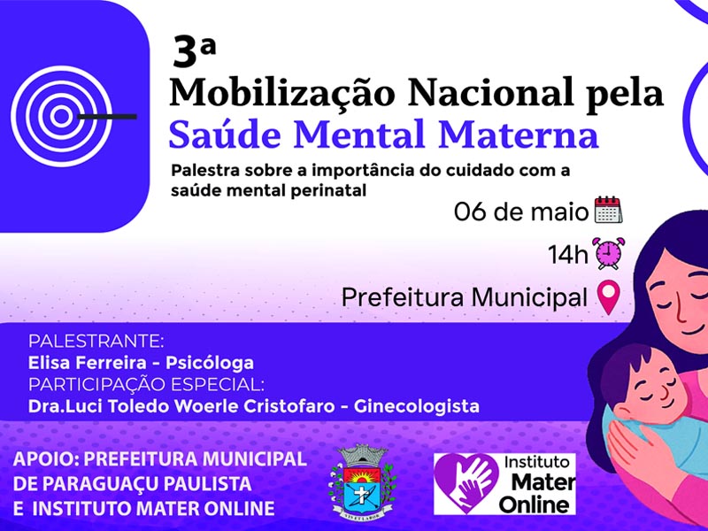 No dia 06 de maio, quarta-feira antes do Dia das Mães, será realizada a Terceira Mobilização Nacional pela Saúde Mental Materna, evento gratuito que integra o calendário oficial do município.