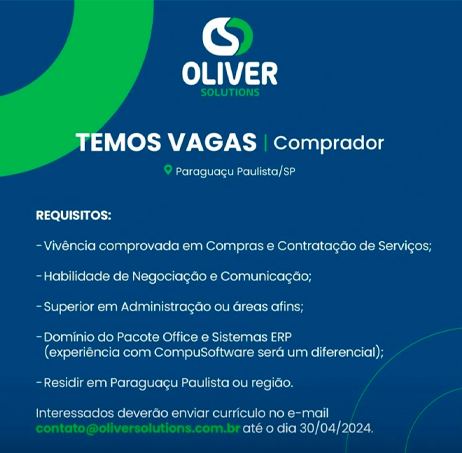 A Oliver Solutions está com uma vaga aberta para o cargo de Comprador.