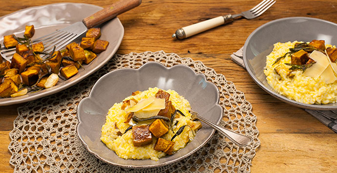 Risoto na pressão já é um clássico do panelinha: não precisa de caldo e fica pronto em 3 minutos. A graça a mais desta versão é a abóbora assada, que deixa o prato lindo e saboroso.