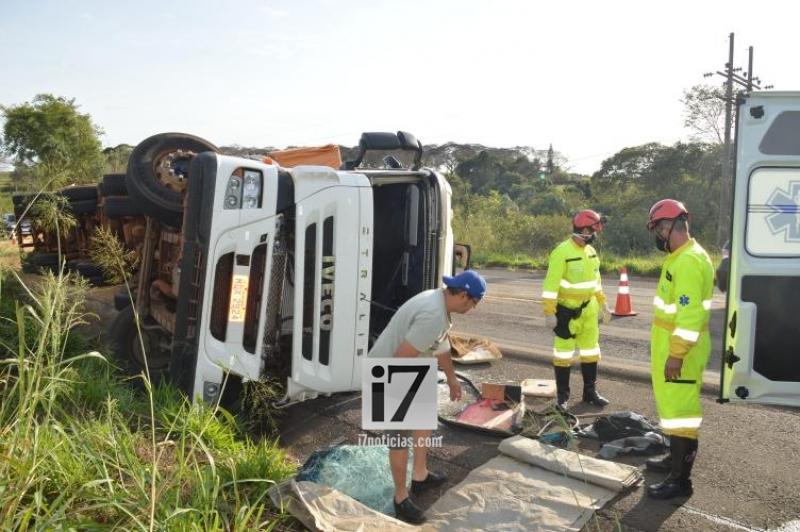Por volta das 09h, o veículo de carga, com placas de Rio Verde/GO, tombou, próximo ao presídio, após ser “fechado” por outro veículo.