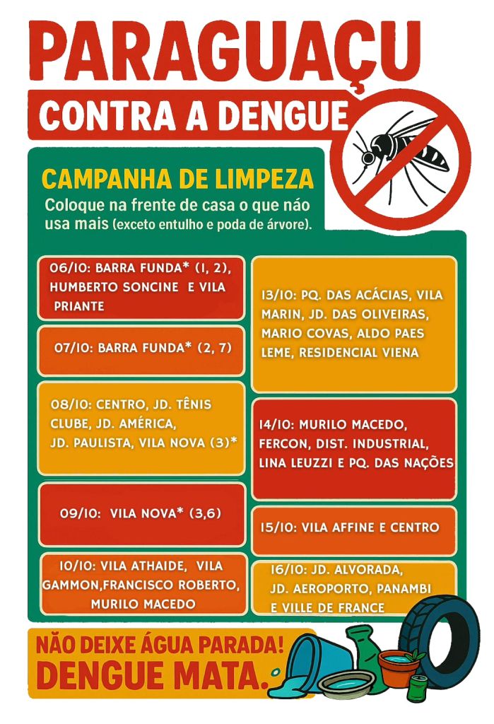 Nesta quarta-feira (08), a ação já percorre os bairros Centro, Jardim Tênis Clube, Jardim América, Jardim Paulista e Vila Nova. A iniciativa é uma realização da Prefeitura Municipal de Paraguaçu Paulista, por meio da Secretaria Municipal de Saúde e da Vigilância em Saúde, em parceria com a Secretaria de Obras, responsável pelo apoio logístico na coleta. O objetivo é eliminar focos do mosquito e reforçar a prevenção em toda a cidade.