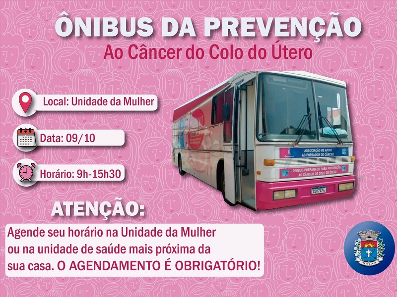 Será realizada a coleta de exames preventivos contra o câncer de colo de útero (Papanicolau) em um ônibus especialmente adaptado que estará disponível das 9h às 15h30 em frente à Unidade de Atendimento à Mulher. A ação é realizada em parceria com a Associação de Apoio às Pessoas com Câncer de Presidente Prudente.