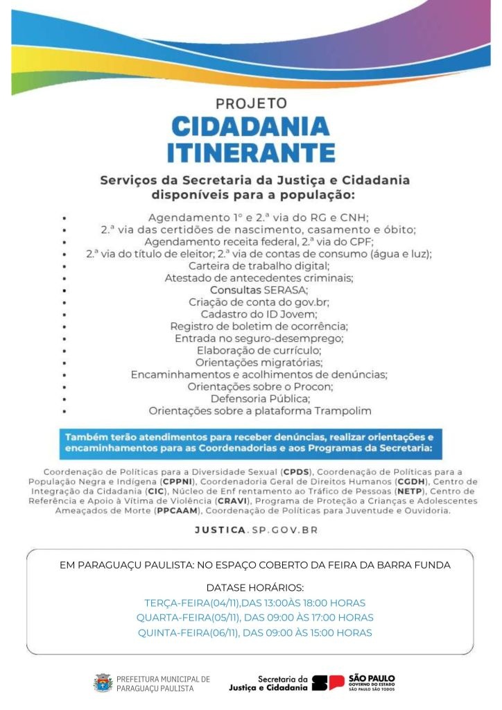 A Prefeitura Municipal de Paraguaçu Paulista, por meio da Secretaria de Desenvolvimento Econômico, em parceria com a Secretaria da Justiça e Cidadania do Governo do Estado de São Paulo, realiza nos dias 4, 5 e 6 de novembro o projeto Cidadania Itinerante.