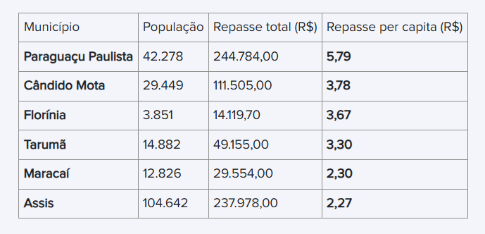 Entre os municípios com mais de 10 mil habitantes da região da qual Paraguaçu Paulista faz parte, o repasse em relação ao número de habitantes foi superior aos das outras cidades próximas. Enquanto Paraguaçu Paulista recebeu R$ 5,79 por habitantes, até mesmo Assis, por exemplo, que tem mais que o dobro da população, recebeu R$ 2,27 por pessoa. Confira o comparativo na tabela abaixo: