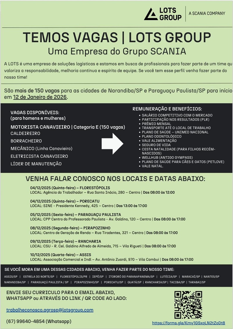 A LOTS Group, empresa do Grupo Scania, está com mais de 150 vagas de emprego abertas para atuação nas cidades de Narandiba-SP e Paraguaçu Paulista-SP, com início previsto para 12 de janeiro de 2026. As oportunidades são voltadas para homens e mulheres que desejam ingressar no setor de soluções logísticas.