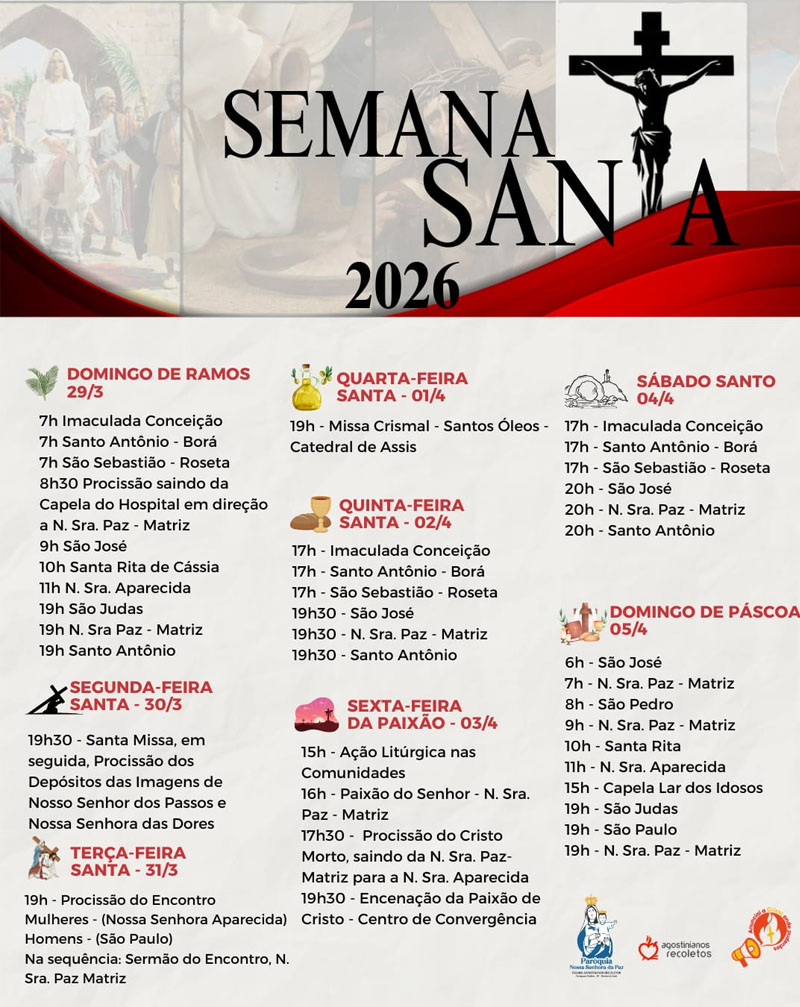 As atividades têm início no Domingo de Ramos, 29 de março, com missas às 7h nas comunidades Imaculada Conceição, Santo Antônio (Borá) e São Sebastião (Roseta). Às 8h30, será realizada uma procissão saindo da Capela do Hospital em direção à Nossa Senhora da Paz (Matriz). Ainda pela manhã, haverá celebrações às 9h na Igreja São José, às 10h na Santa Rita de Cássia e às 11h na Nossa Senhora Aparecida. À noite, as missas acontecem às 19h nas igejas São Judas, Nossa Senhora da Paz (Matriz) e Santo Antônio.