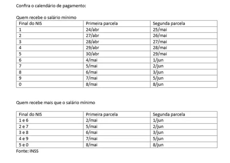 O benefício extra será pago em duas parcelas. A primeira será paga nesta sexta até 8 de maio. A segunda vai de 25 de maio a 8 de junho. As datas são definidas com base no dígito final do Número de Inscrição Social (NIS) e com base na renda do beneficiário. Quem ganha apenas o salário mínimo começa a receber antes de quem recebe mais que o mínimo.