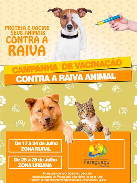 Nos dias 17 a 24 de julho, a iniciativa acontecerá na zona rural de Paraguaçu Paulista. Já no período de 25 a 28 de julho, a vacinação será realizada na zona urbana, quando as equipes da Vigilância em Saúde percorrerão os bairros. O roteiro já está disponível em todas as Unidades de Saúde.