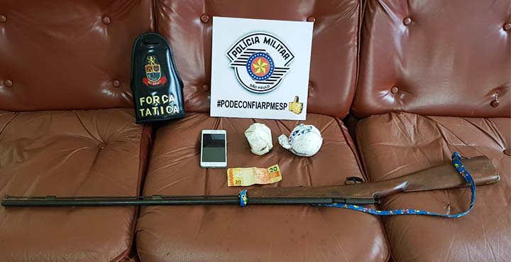 Drogas, dinheiro e espingarda apreendidas durante a ocorrência