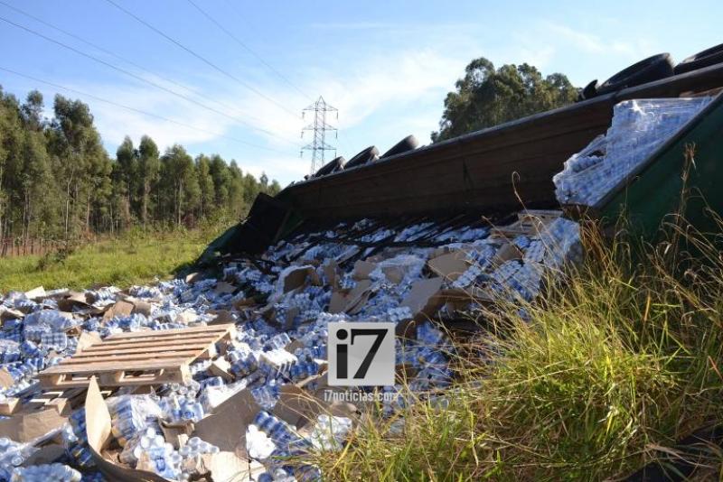 O veículo tombou no acostamento, espalhando toda a carga que transportava