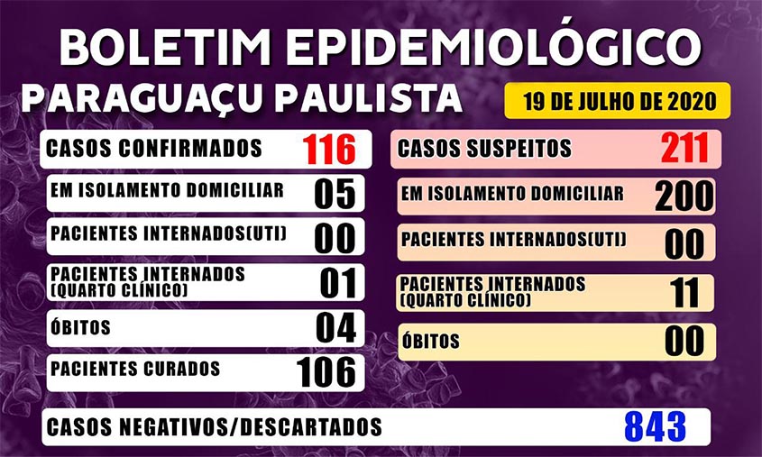 Os dados do Boletim Epidemiológico, divulgados pela Vigilância em Saúde da Prefeitura de Paraguaçu Paulista, demonstram que a situação no município é a seguinte, até este dia 19 de julho: