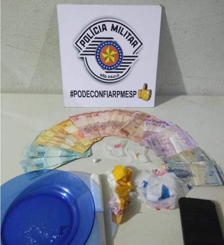 Foram apreendidas pedras de crack, embalagens para drogas e a quantia de R$ 1.084,00