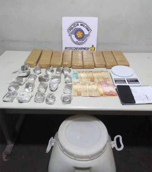 Em revista, os policiais localizaram dentro de um dos quartos um tambor contendo oito tijolos de maconha e mais 20 porções embaladas do mesmo entorpecente. Foram apreendidas também uma balança de precisão e um caderno de anotações do tráfico. Em outro quarto, a equipe encontrou mais um tijolo da droga.