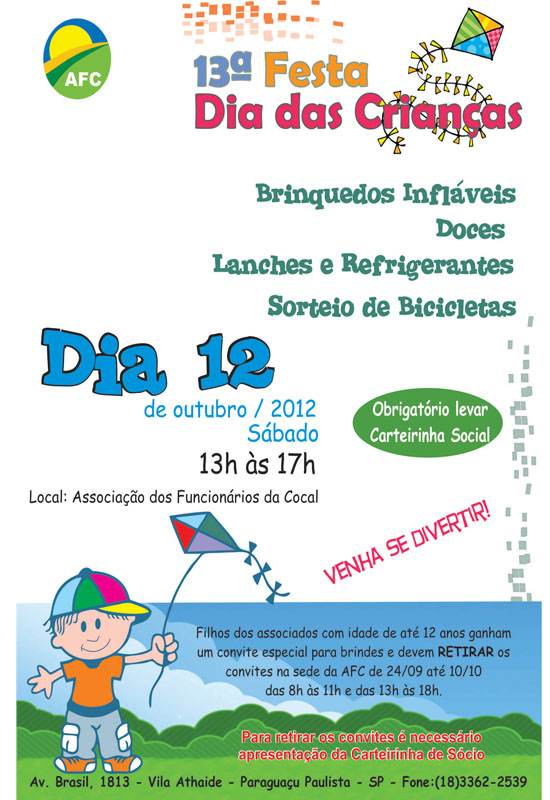 Das 13h às 17h do dia 12, os filhos de até 12 anos dos associados poderão se divertir no parque inflável, e ainda ganharão hot-dog, maçã do amor, brinquedo surpresa, refrigerante, algodão doce, pipoca e kit de doces.