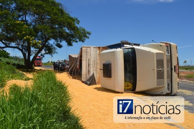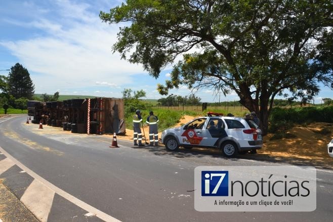 Uma carga de milho em grãos ficou espalhada pela pista e pelo acostamento após a carreta que a transportava tombar, na manhã deste domingo, dia 01, no trevo que dá acesso à cidade de Quatá.