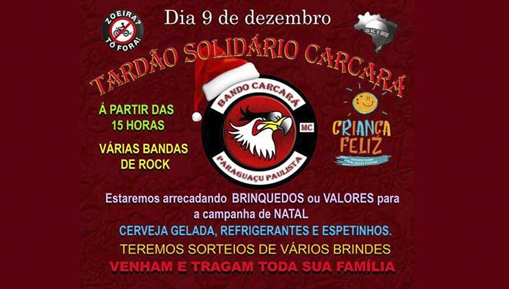 Neste sábado, dia 09 de dezembro, acontece o Tardão Solidário do Carcará Moto Clube em Paraguaçu Paulista, um evento que conta com diversos apoios e é coordenado pela equipe do Moto Clube e seus associados e colaboradores.