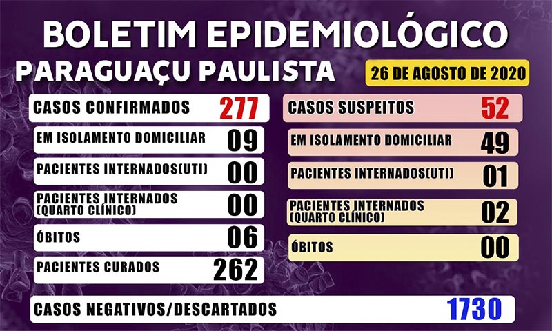 Os dados do Boletim Epidemiológico, divulgados pela Vigilância em Saúde da Prefeitura de Paraguaçu Paulista, demonstram que a situação no município é a seguinte, até este dia 26 de agosto: