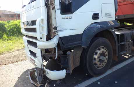 De acordo com informações, uma carreta parou no acostamento para aguardar a passagem do fluxo de veículos, quando sua lateral foi colidia pela lateral de outra carreta. Ambos os veículos ficaram danificados.